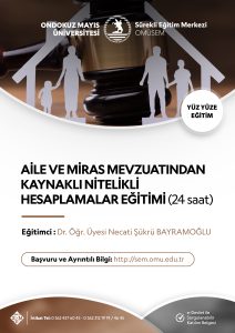 Amaç: Bilirkişilikte Nitelikli Hesaplamalar temel alanının alt uzmanlık alanlarından olan Aile ve Miras Mevzuatından Kaynaklı Nitelikli Hesaplamalar alanında bilirkişilik yapabilmek için gerekli bilgi ve eğitimin verilmesi amaçlanmaktadır.